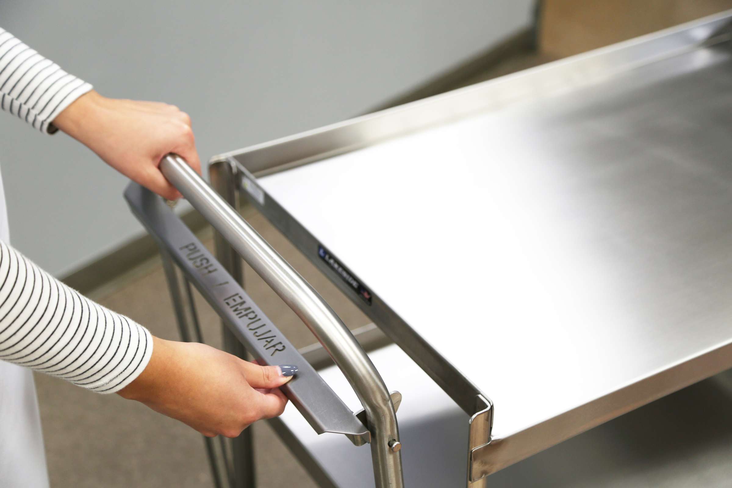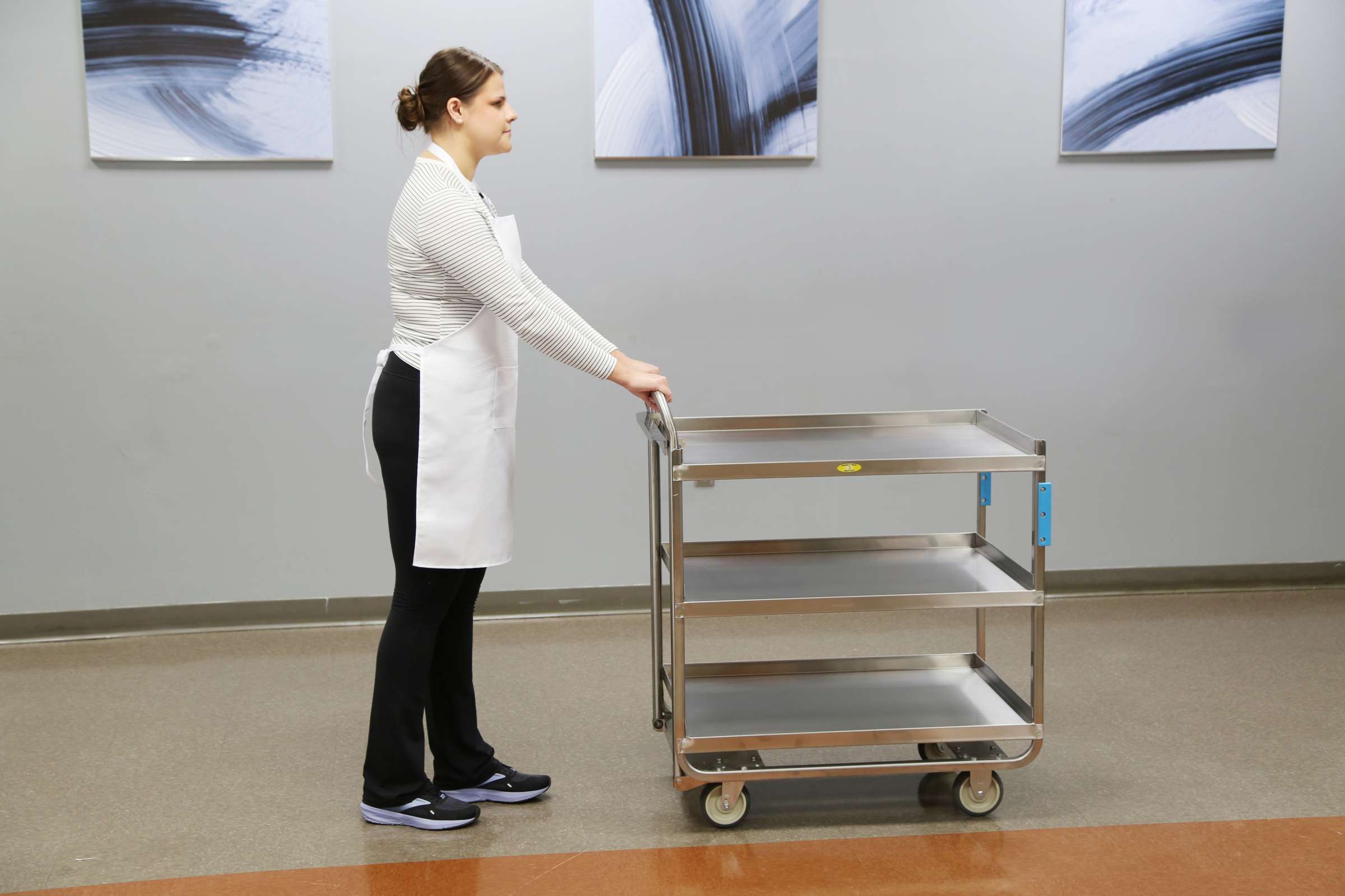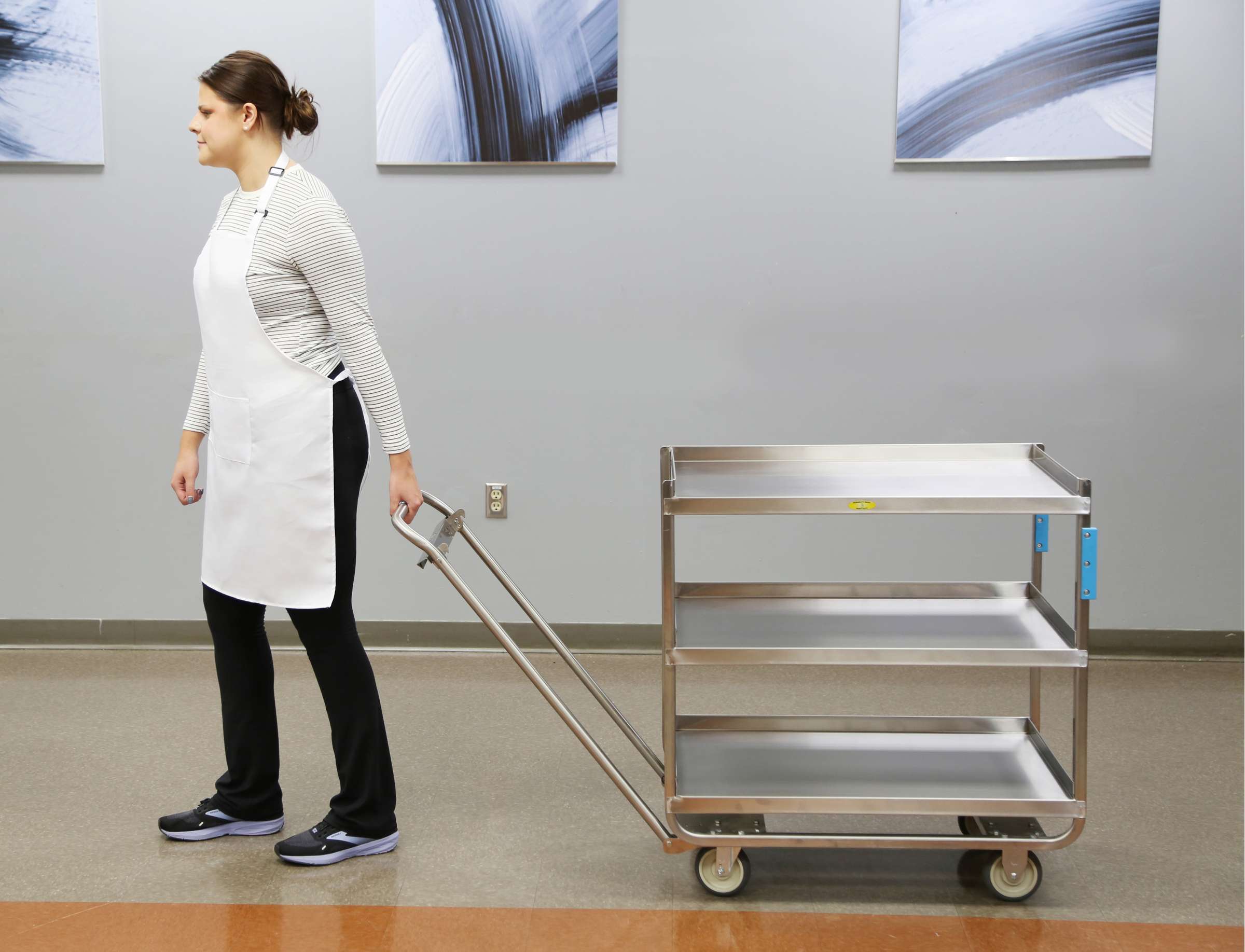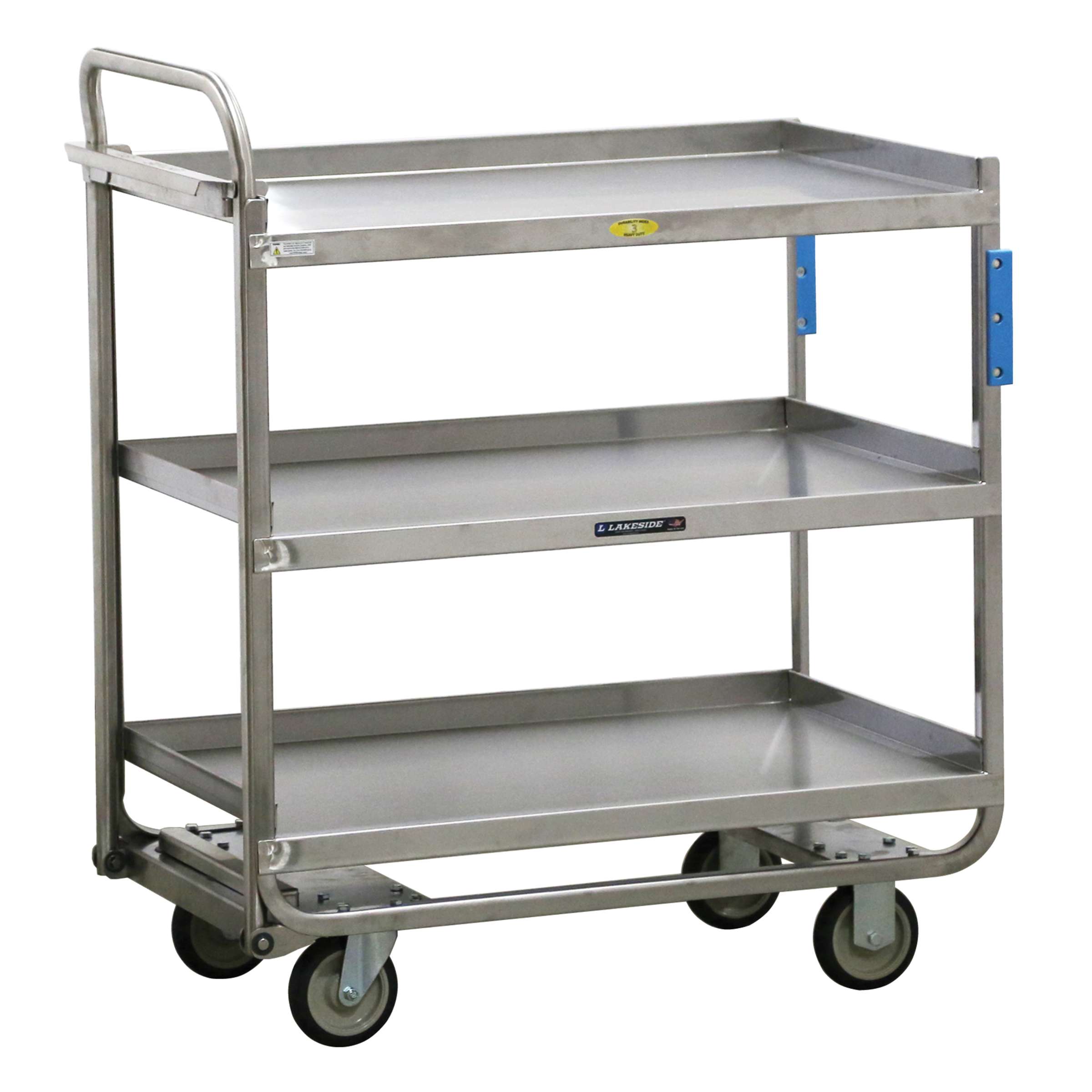Push-Pull Utility Carts by Lakeside Manufacturing provide flexibility of pushing and safely pulling actions when hauling heavy-duty loads. The Lakeside 163421 Push-Pull Utility Cart with (3) shelves measuring 21" x 33" has a weight capacity of 700-Lb. This Lakeside cart's Push-Pull Handle allows for safe pushing or pulling action, while its hinged handle locks securely in the upright position for conventional pushing action. This utility cart's all-welded stainless steel construction is easy to clean and sanitize. This cart on wheels is equipped with 5” cushion tread casters, 2 ea. fixed, 2 ea. swivel with brake for smooth maneuverability. This cart's durable 700-Lb. carrying capacity allows for easy transport of heavy-duty loads over long distances. It provides full visibility when pulling cart to ensure operator safety. This cart is offered with an optional on-board stowable drawbar system that allows for towing of multiple carts. This multifunctional piece of equipment helps save money, time, and space. Easy to load and unload. Push or pull loads for ultimate flexibility. Endless variety of customizable options. Superior lead times. Made in the USA.