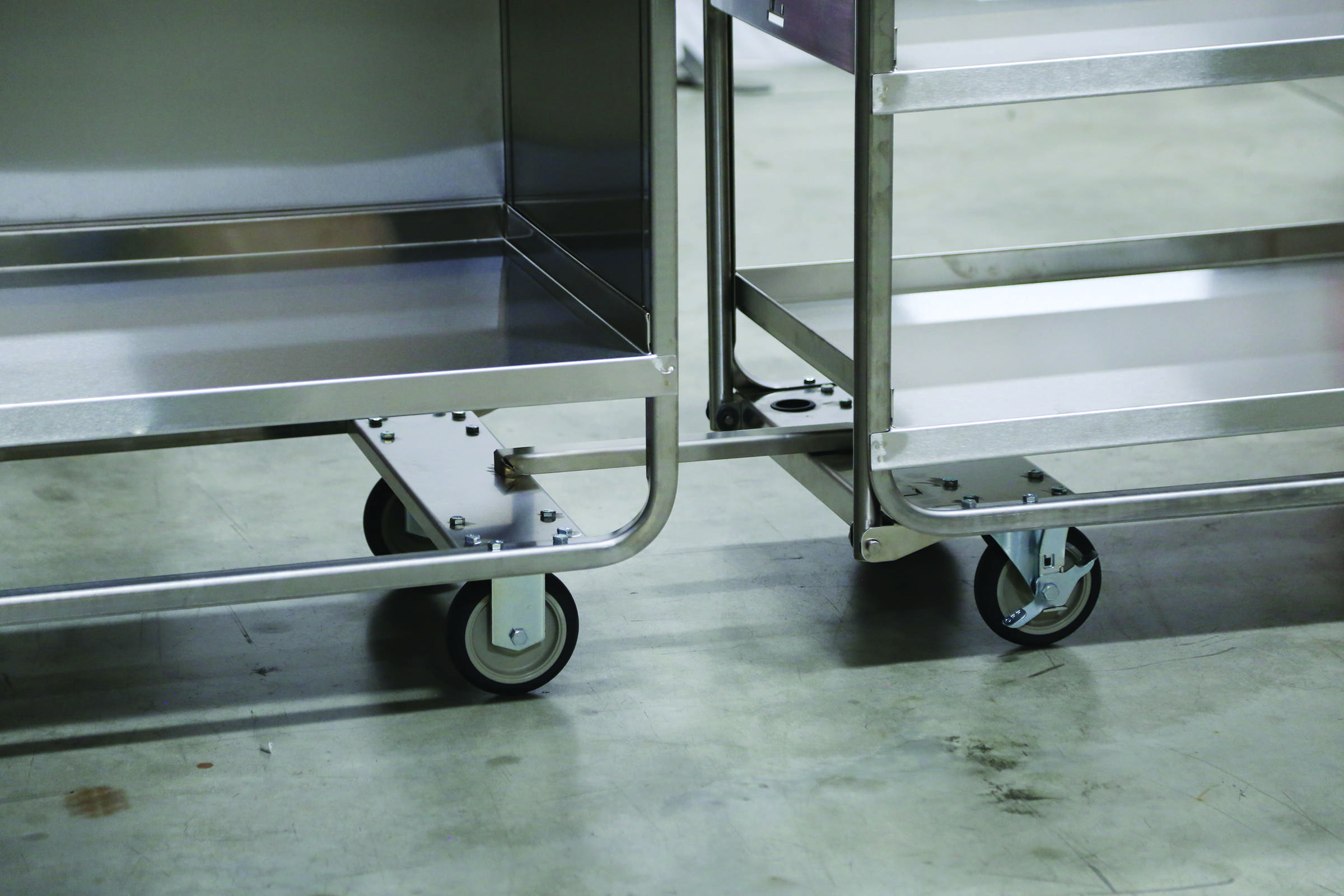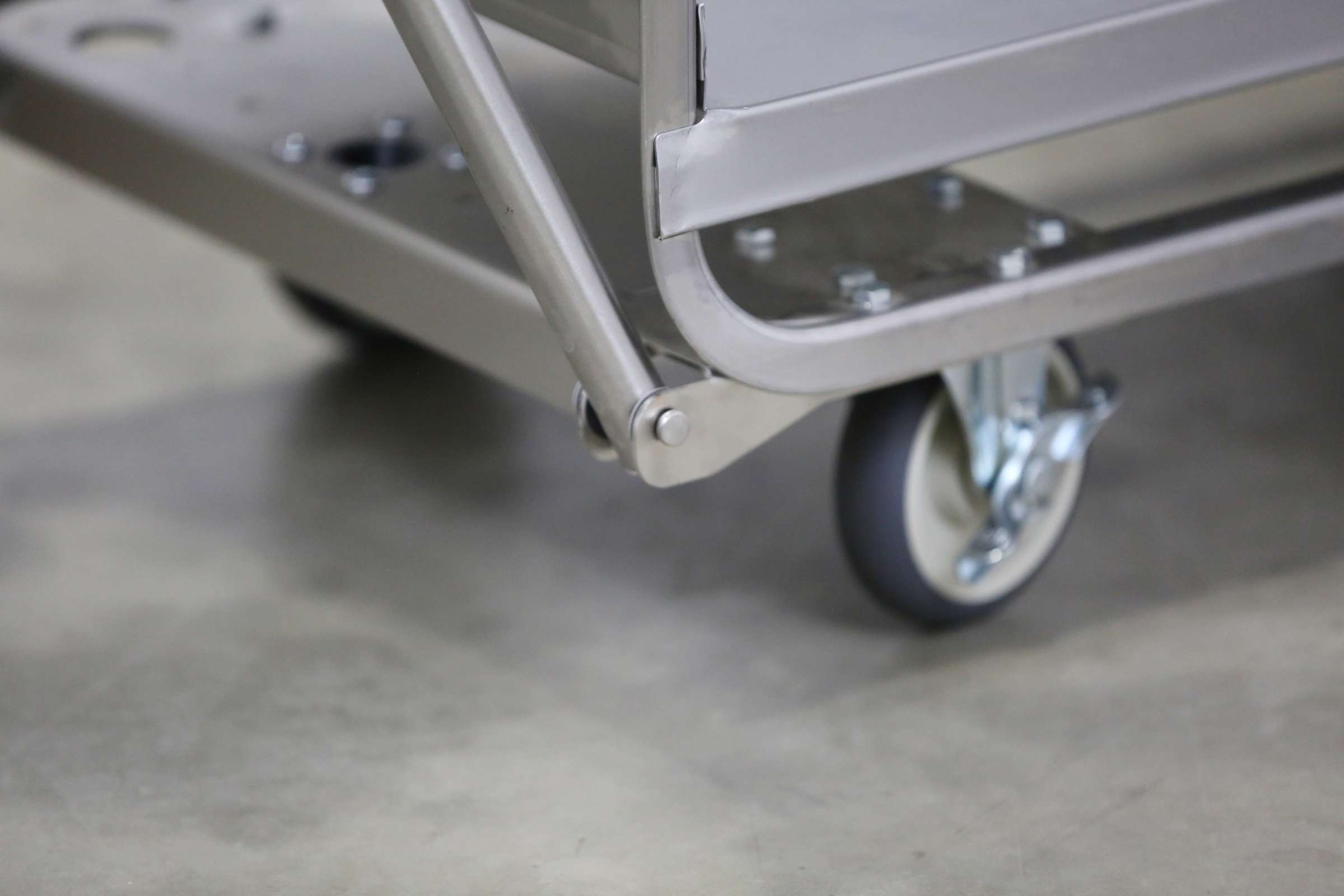 Product Specification: Lakeside model 163421 is of welded stainless steel U-frame construction. Shelves are 18-gauge and U-frame is 1" x 1" x 1/8" angle stainless steel. Full-height tubular handle is hinged at the bottom to swing out for pulling action, and locks in upright position for pushing action. Optional on-board stowable drawbar system includes receiver bushing and connects frame cross members to allow for towing of multiple carts. Casters are 5" (2 ea. fixed and 2 ea. swivel with brake) non-marking with cushion tread, fastened to reinforced 18-gauge stainless steel cross members for extra strength.