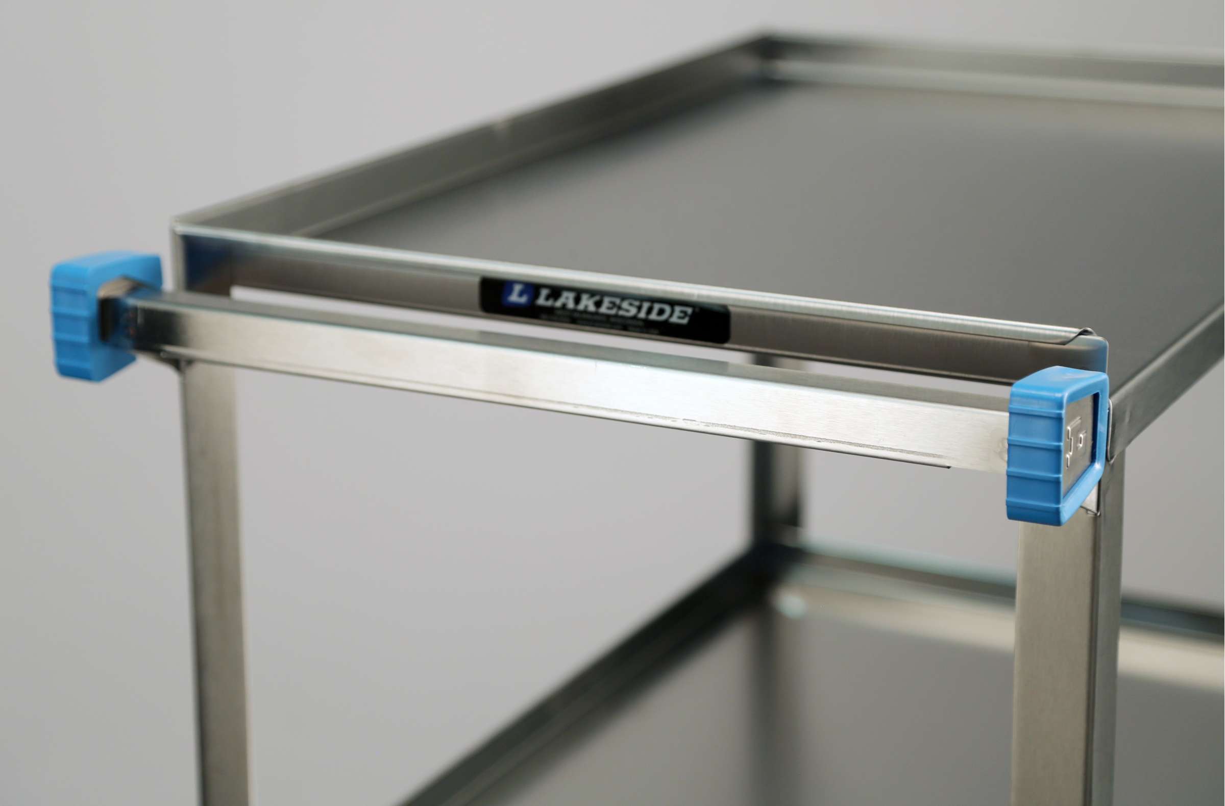 Product Specification: Unit shall be Lakeside Model 311 and shall have stainless steel unitized electronic welding to fasten shelves and handle to frame with a weight capacity of 300-Lb. (136 kg). This cart shall have 3 ea. open shelves measuring 15-1/2" x 24" and be constructed of 22-gauge stainless steel. Shelves shall have 11-3/4" clearance and be reinforced with a hemmed front. All-welded angle legs shall be constructed of 20-gauge stainless steel. Unit shall have a stainless steel push handle welded to frame, and shall have corner bumpers mounted to front legs and ends of push handle. Unit shall have an independent galvanized steel dolly frame fastened to the bottom with 8 screws. Bottom corners shall be rounded. Four each 3-1/2" double race, double-ball bearing swivel casters shall be mounted to the dolly frame. Unit shall be listed as light duty. Made in USA.